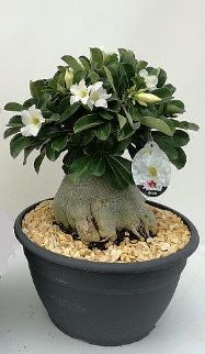 Adenium obesum, auch Wüstenrose genannt. Adenium unterscheidet sich von anderen wegen seiner großen Stamm in Kombination mit den bunten Blumen. De Adenium ist gepfropft oder kommen aus Sämlingen. Der Unterschied zwischen Sämlinge und Gepfropft sind die Farben und die Menge von Blumen.